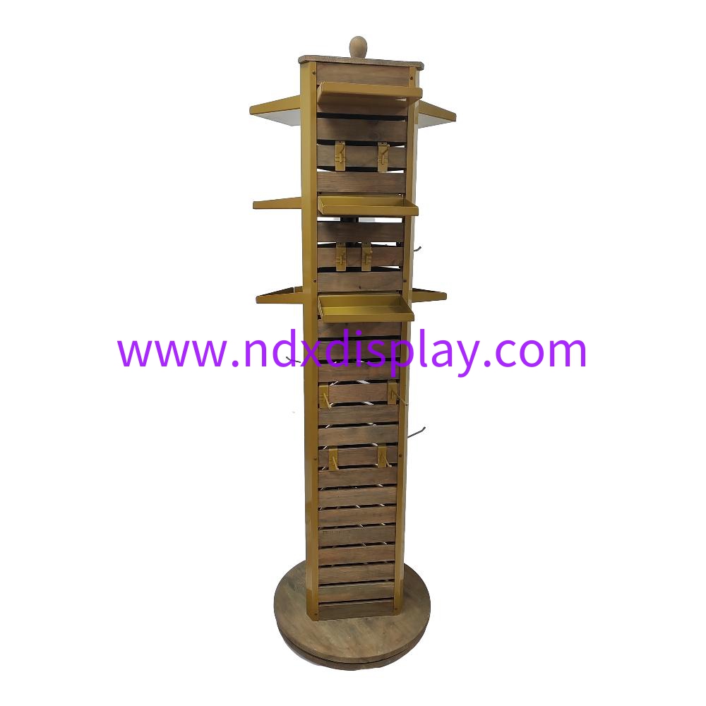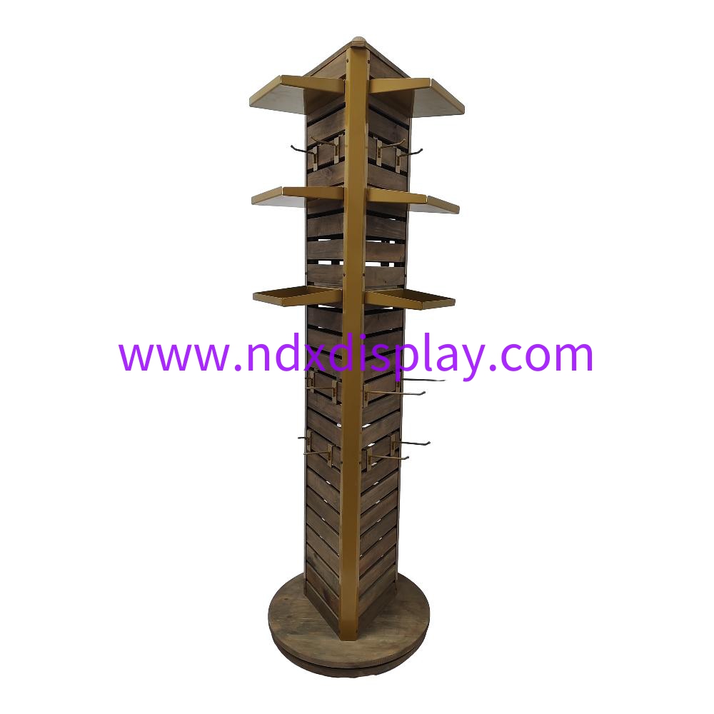 20" W x 20"D x 65"H Solid Wood Spinner Rack with Metal Shelves and Slatwall Hooks